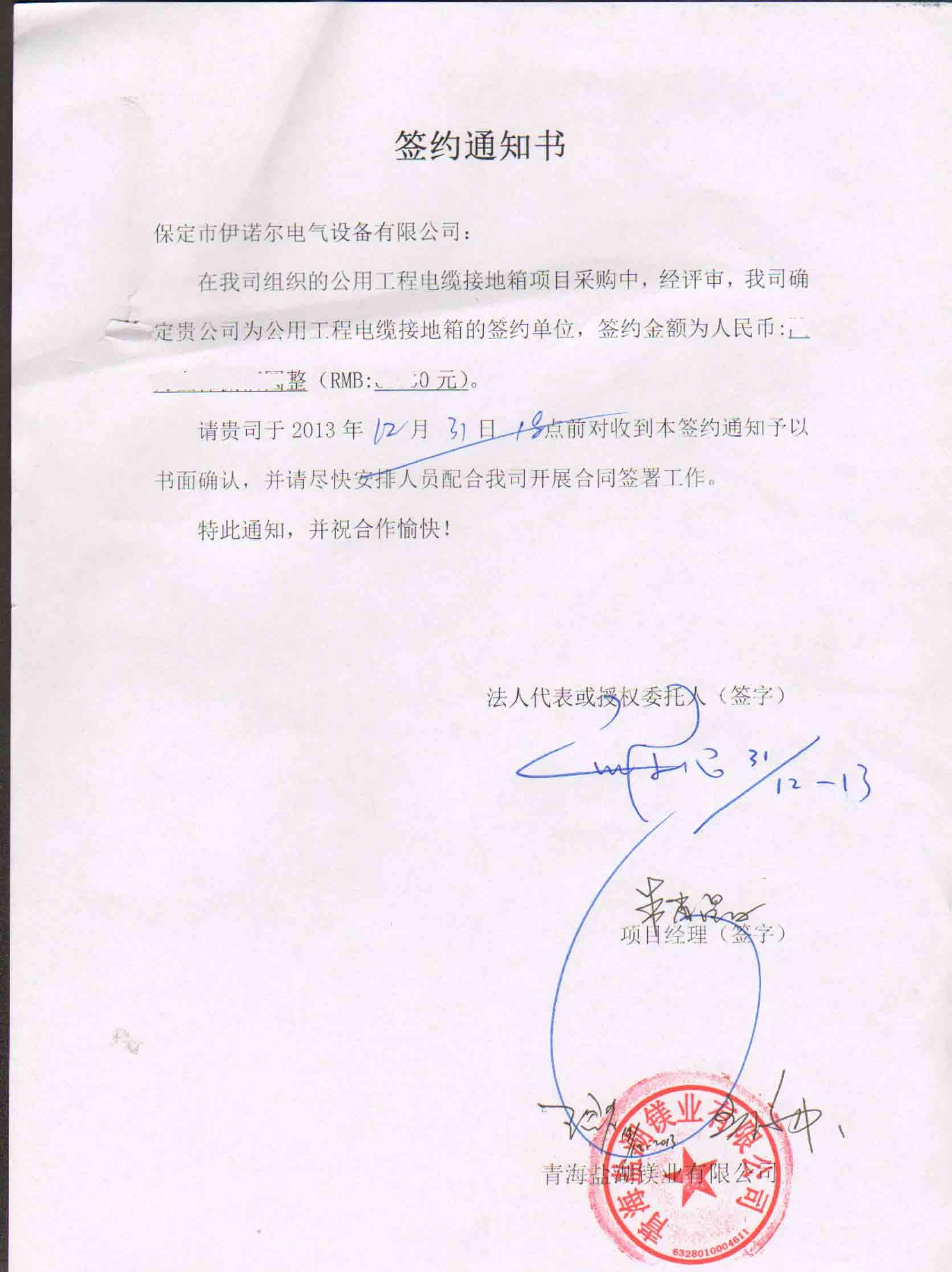 保定伊諾爾電氣從11月份開始與青海鹽湖工業集團股份有限公司下屬子公司青海鹽湖鎂業接觸,參與金屬鎂一體化項目公用工程項目35KV新建線路電纜接地箱設備評標工作。經評審,保定伊諾爾電氣被評為中標單位,12.31日向我司發送簽約通知書。并于1.10日到貨。